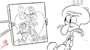 - On Squidward's painting, SpongeBob'south arm is the same color as Squidward'south pare.